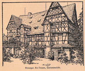 "Das untere Schloss, jetzt Rittergut Alt-Treuen ist Eigentum der Familie Adler. Unser Vollbild zeigt den geräumigen Gutshof. [...] Das kleine Bild läßt uns einen Blick auf den reichgegliederten und reichgegiebelten Fachwerkbau vom Garten aus tun. Das Ganze wirkt durchaus bodenständig und seiner Bestimmung entsprechend"